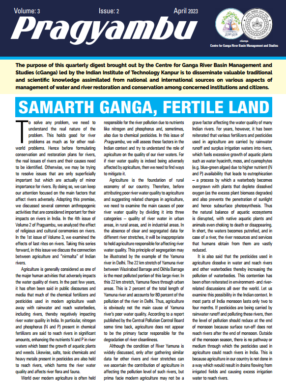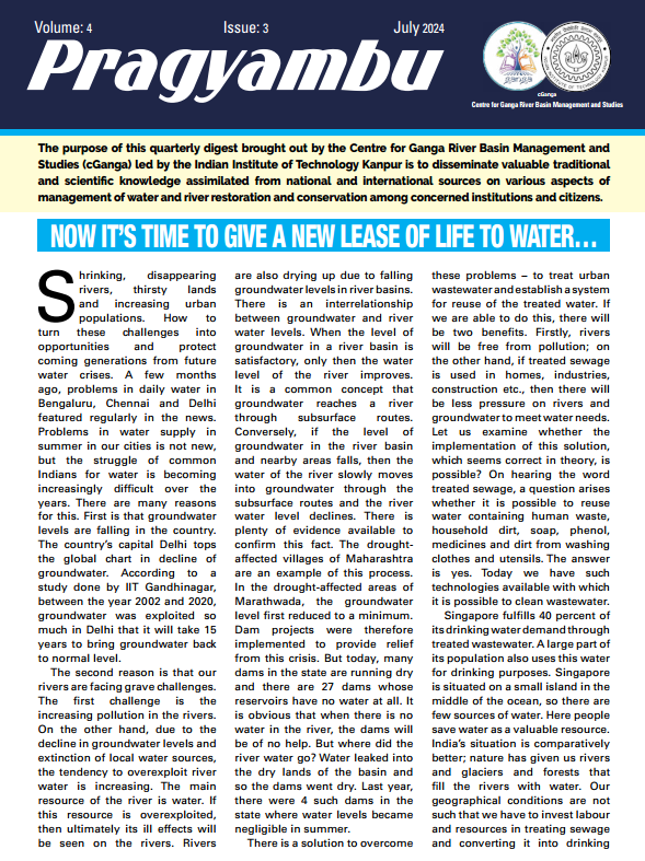 The purpose of this quarterly digest brought out by the Centre of Ganga River Basin Management and studies (cGanga) lead by the IIT Kanpur is to disseminate valuable traditional and scientific knowledge assimilated from national and international sources on various aspects of management of water and river restoration and conservation among concerned institutions and citizens.